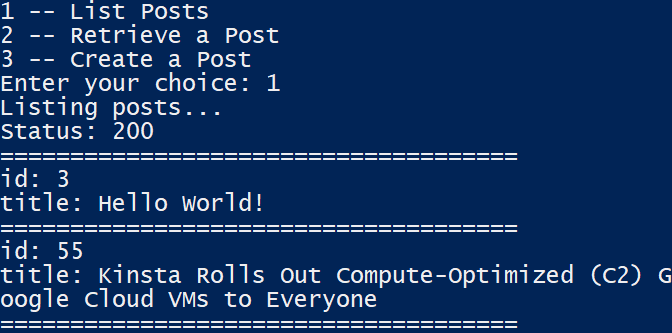 然后,运行应用程序并尝试选项3,传递一个标题和内容,在WordPress中创建一个新的文章。