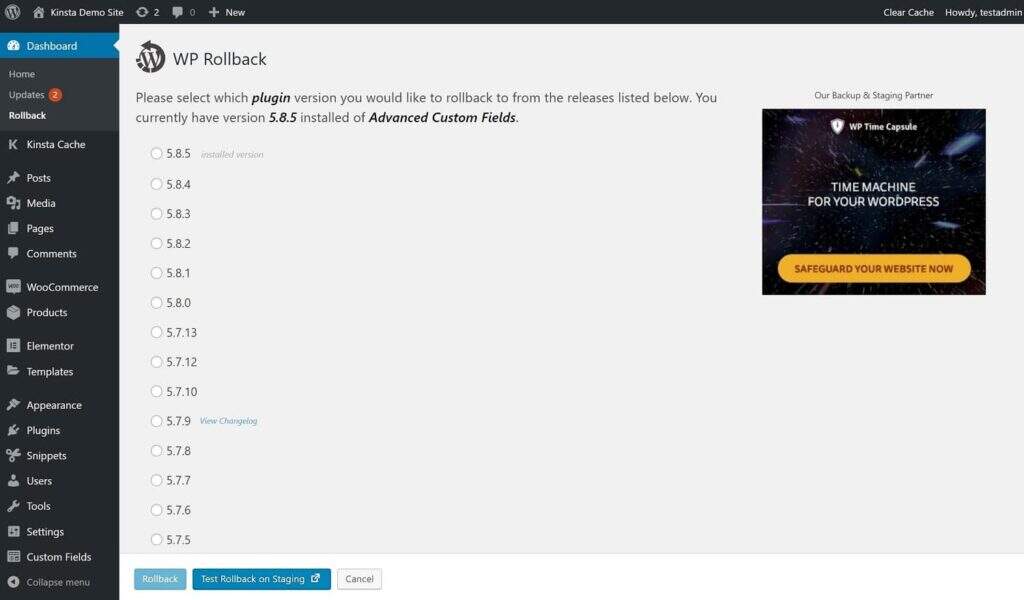 WP Rollback并不像之前的解决方案那么全面,它只适用于WordPress.org的主题和插件。不过,在更有限的基础上,它确实是一个非常有用的版本控制工具。