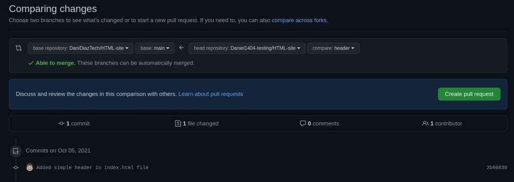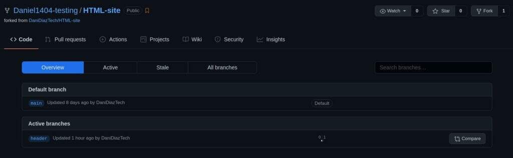 在这之后,你应该可以在你的分叉仓库中看到一个名为 header 的新分支(例如:https://github.com/yourusername/HTML-site/branches):