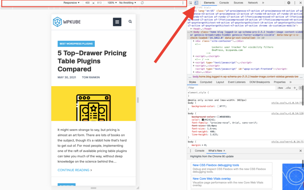 点击开发者工具顶部看起来像手机和平板电脑的小图标。这将调整浏览器视图的屏幕大小,以便您可以看到您的网站在较低分辨率下的外观。