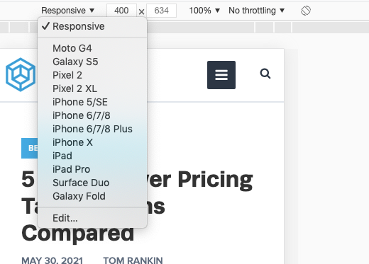 它还将在浏览器视图的顶部添加一个额外的工具栏。您可以使用它来更改它正在模拟的设备、手动设置屏幕分辨率、调整缩放、更改设备的旋转以及设置节流级别以查看页面加载时间受到的影响。