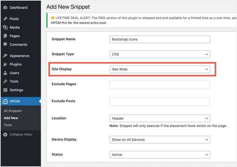 - Site Display – 在此处选择“站点范围”选项以在整个站点中插入 CSS。否则,请从可用选项之一中进行选择,例如特定文章、页面、类别、标签、主页等。您将看到基于您的选择的其他选项。例如,选择特定文章将显示用于选择文章的“文章列表”下拉菜单。您可以选择要在其中显示图标的单个或多个文章。如果您想在站点范围内使用,则可以通过从排除列表中选择它们来排除在某些文章和页面上加载 CSS。