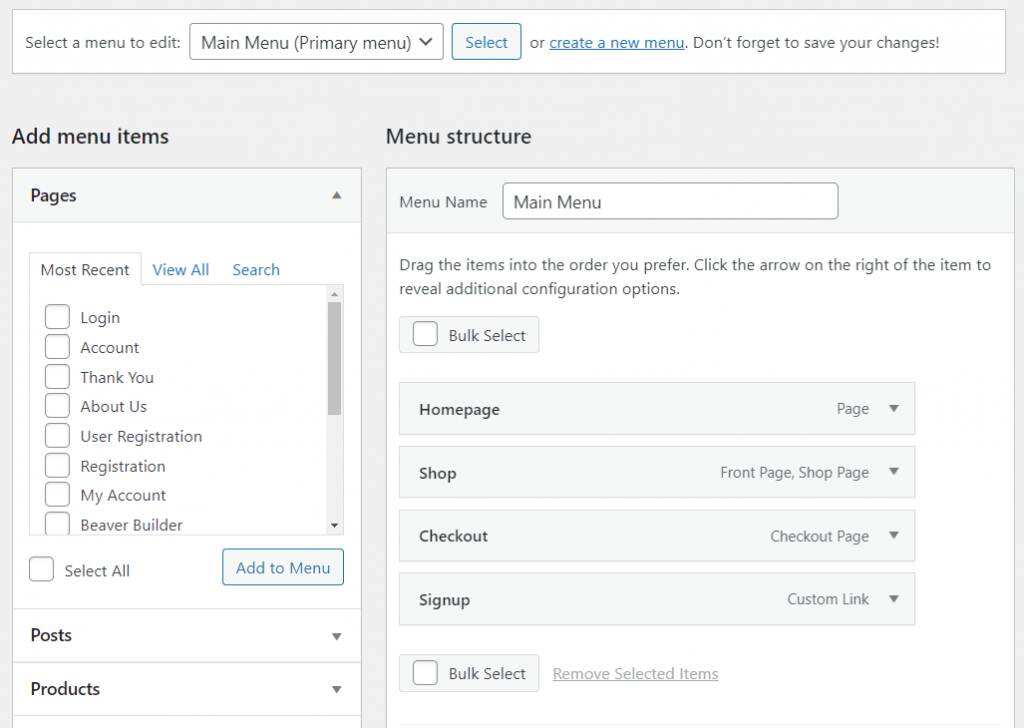 然后,使用左侧的列表选择您希望菜单包含的元素,然后在“菜单结构”部分下重新排列它们。