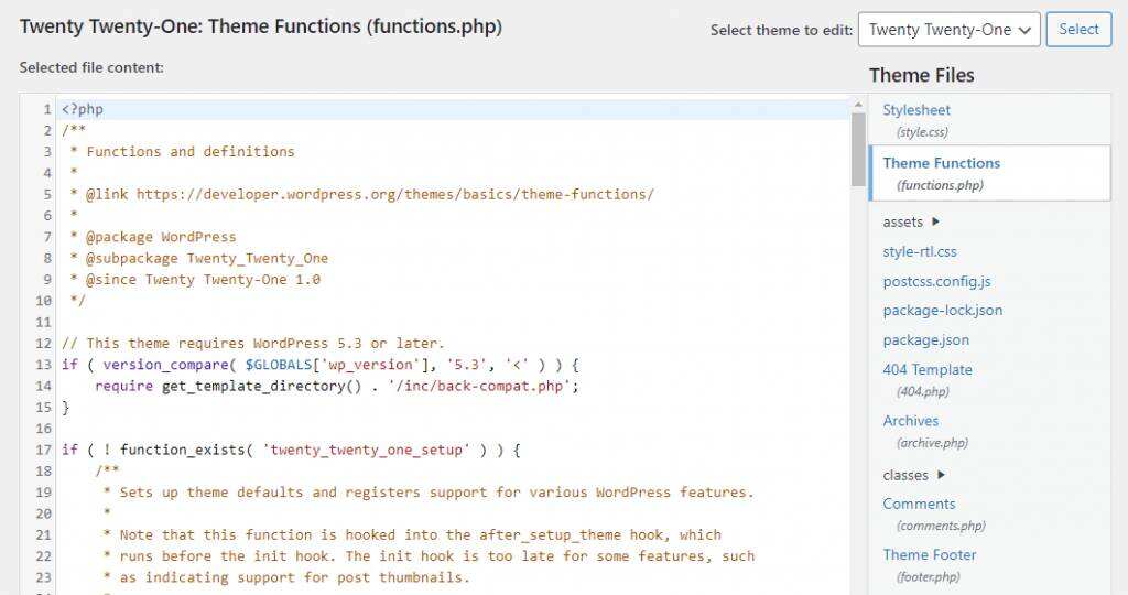 主题编辑器应该打开到您的活动主题,您可以使用右侧的菜单选择functions.php文件。