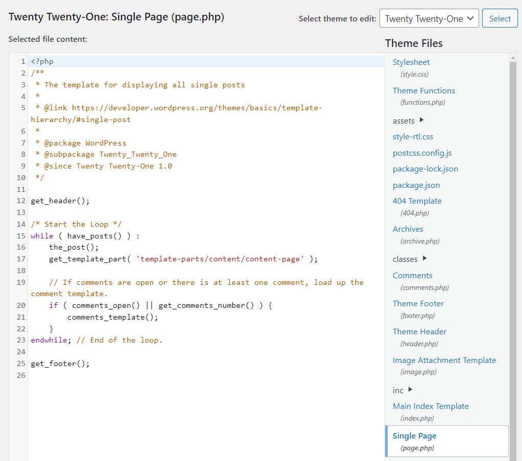 在我们的示例中,我们选择了主题的单页模板。您需要添加到模板的代码应如下所示:
