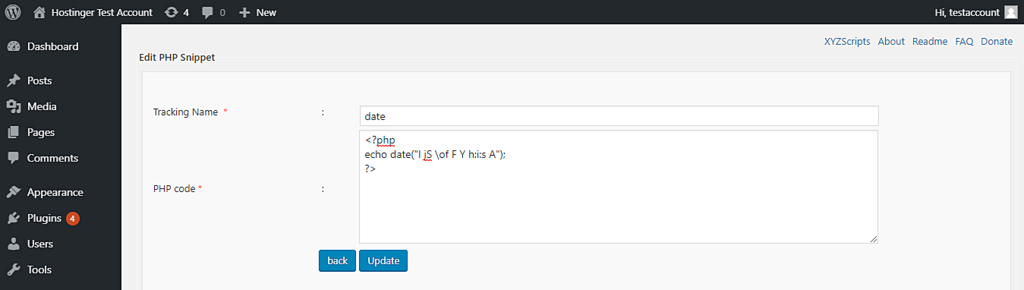 1. 从您的WordPress仪表板,导航到XYZ PHP Code -> PHPCode Snippets。