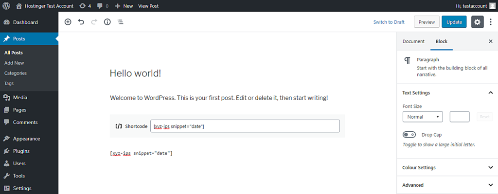 4. 要将PHP代码添加到WordPress文章或页面,请将要使用的函数的片段短代码粘贴到所需位置。如果您使用的是Gutenberg区块编辑器,请使用简码或代码区块来显示它。