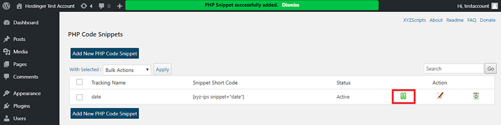 3. 如果该过程成功,屏幕上将出现一条确认消息和新功能。为将来使用,请通过检查“Action”部分确保您要使用的所有PHP函数都处于活动状态。活动的代码片段将显示一个绿色的暂停符号,而非活动的代码片段旁边将有一个绿色的复选标记。