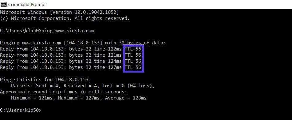 在此测试期间,ping记录来自四个单独数据包的结果。它显示花费的时间量和TTL,显示这些数据包花费了多少“跳”。