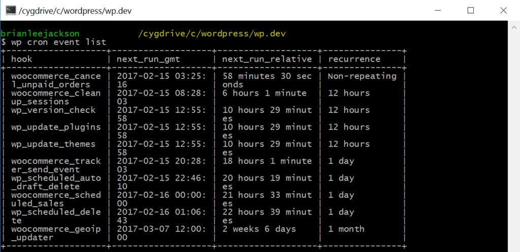 您可以在WP-CLI中管理WP-Cron事件和/或WordPress Cron作业。例如,以下命令将为您提供当前的cron事件列表。