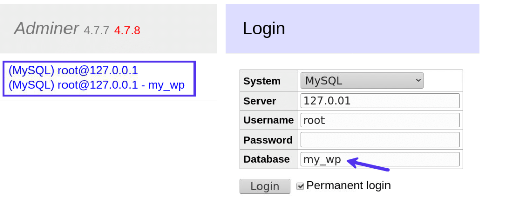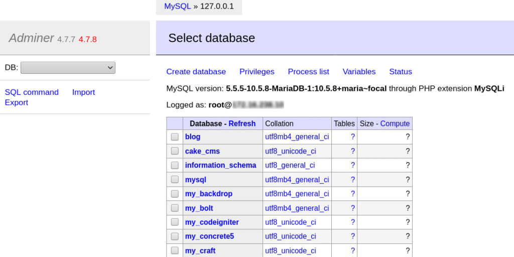 如前所述,您可以连接到Adminer支持的任何数据库服务器。对于MySQL数据库服务器,默认用户名是root,默认密码是空字符串。您还可以在此处选择要管理的现有数据库。