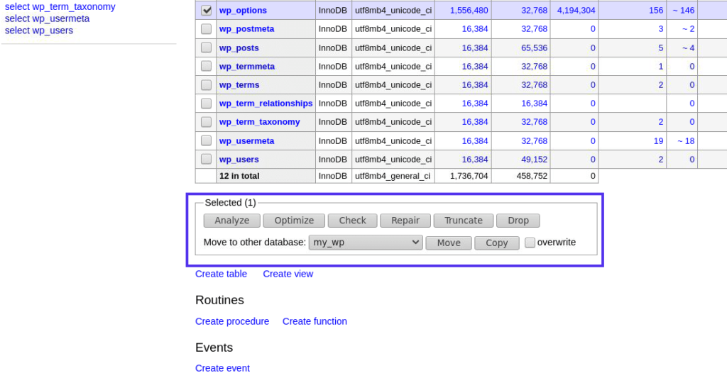 从这里,您还可以将表Move或Copy到另一个数据库。使用Overwrite选项,这是一种将站点数据(例如帖子和评论)从一个站点传输到另一个站点的快速而肮脏的方式。