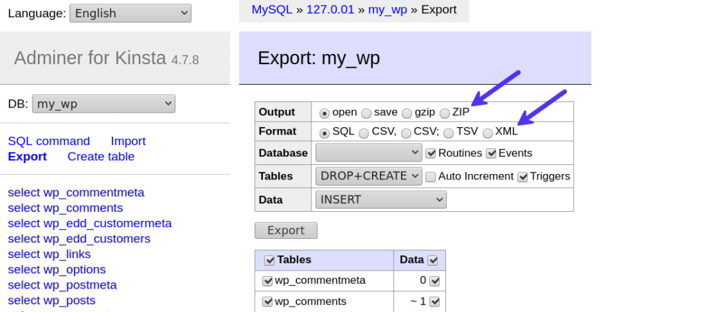 同样,使用 Adminer备份现有数据库也非常简单。单击Export链接,然后选择导出选项,例如输出类型、格式和其他数据库设置。您还可以选择要导出的表。