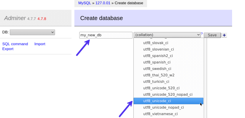 在Adminer中创建新数据库