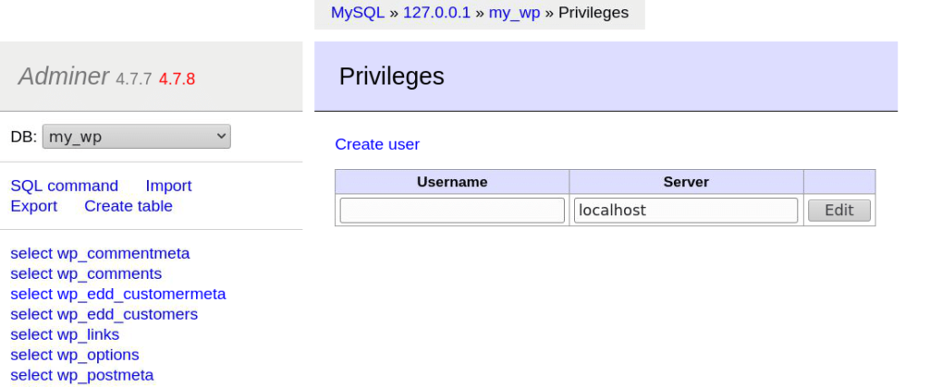 您可以使用Adminer为您的数据库创建具有自定义权限的新用户。在大多数情况下这是不必要的,但如果您想创建一个新用户,您可以选择快速创建。