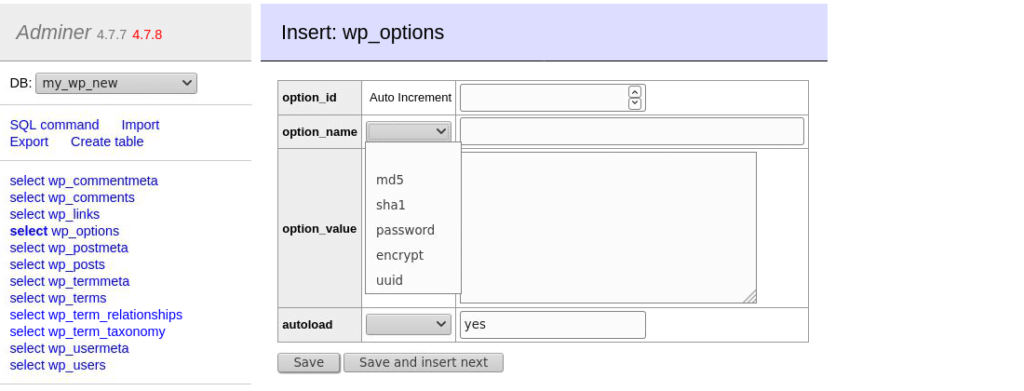 在这里,您可以向表中添加新行。管理员列出了列名称及其类型,以便您可以快速输入它们。您还可以为您输入的值运行散列函数以自动加密它们。如果数据是敏感的,例如密码,这将非常有用。例如,WordPress使用MD5算法将其密码存储在数据库中。