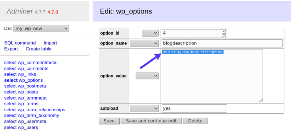 接下来,在option_value字段中输入您的新博客描述,然后单击SAVE按钮以使您的更改生效。