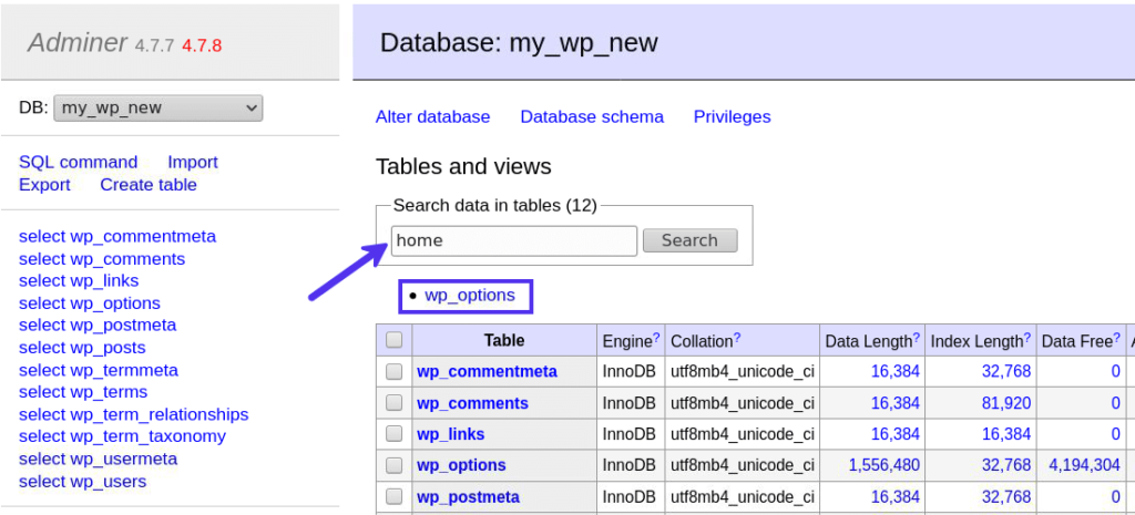 当我搜索词home时,Adminer将wp_options表作为最有可能的候选者。单击它会向我显示Adminer在数据库中找到它的确切列和行。