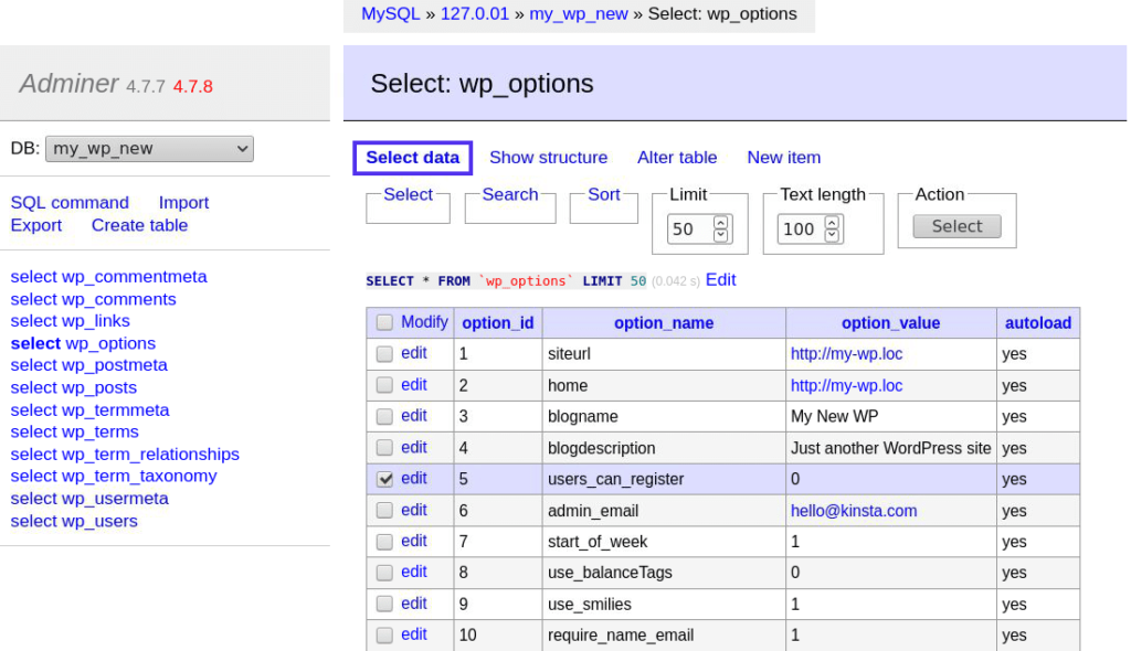 上面的示例显示了有关wp_options表的详细信息。这是WordPress存储其所有重要设置的地方。接下来,您可以转到“Select data”选项卡以查看存储在此表中的所有值。
