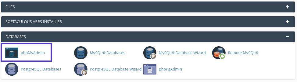 如果您的托管服务提供商使用cPanel,那么您可以浏览并选择Databases下的phpMyAdmin: