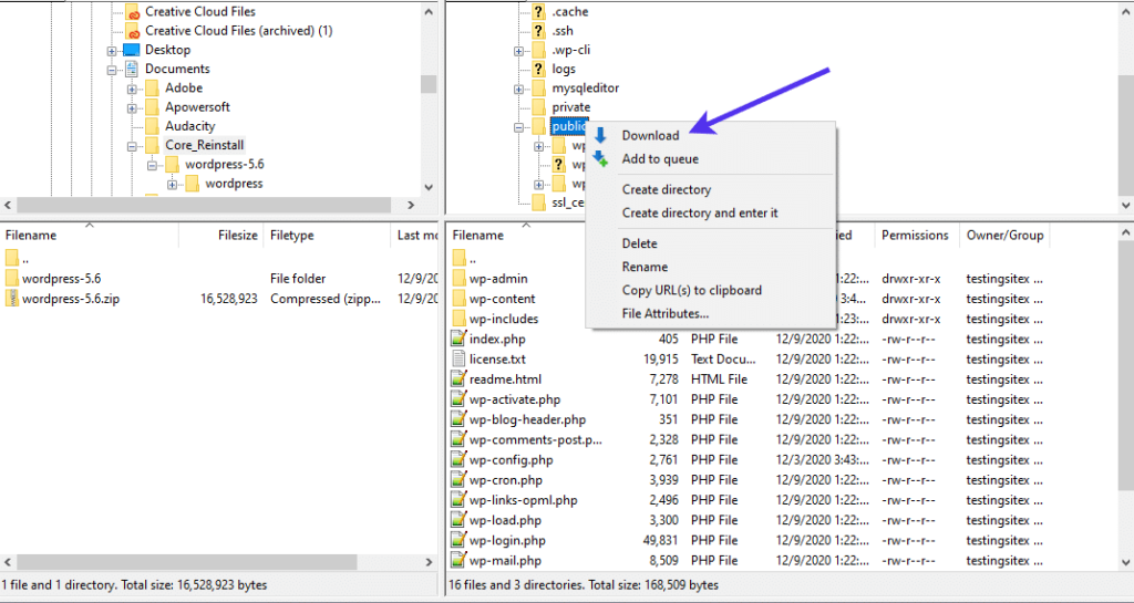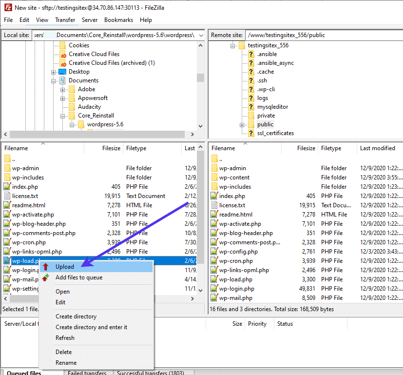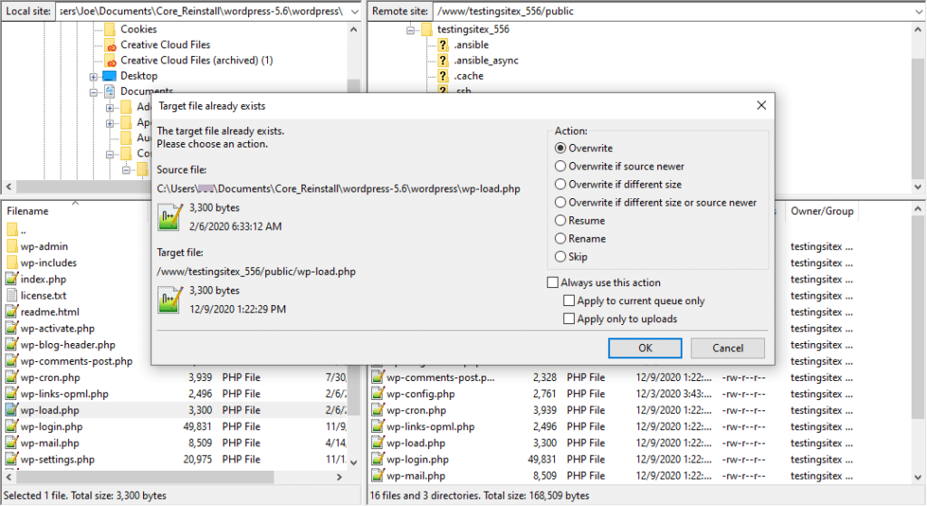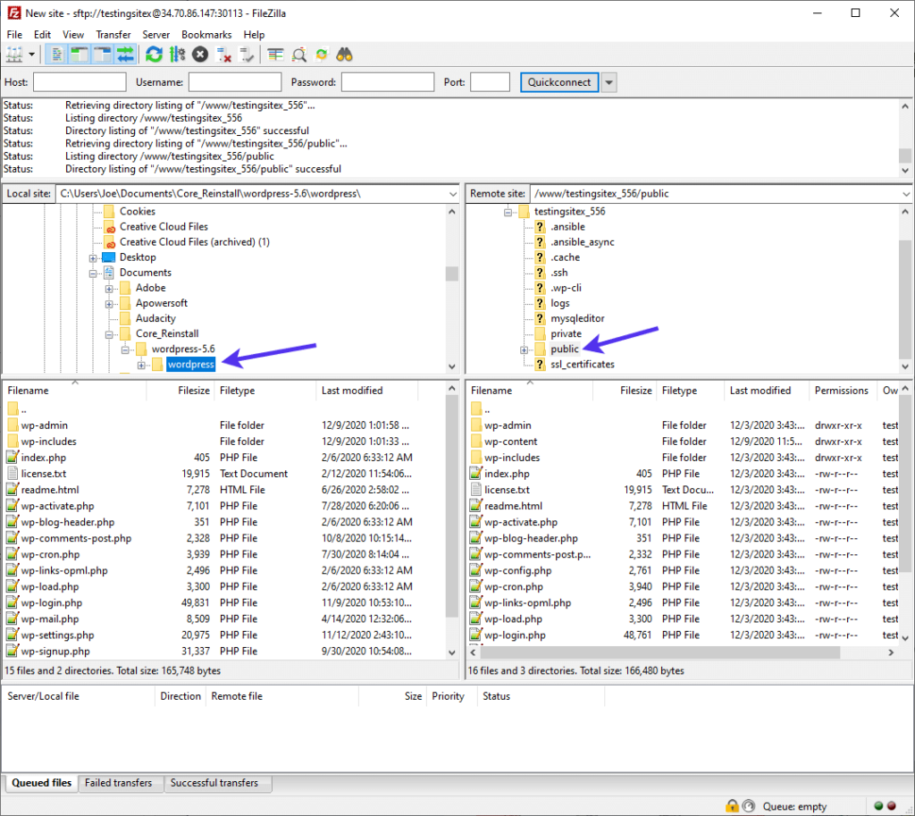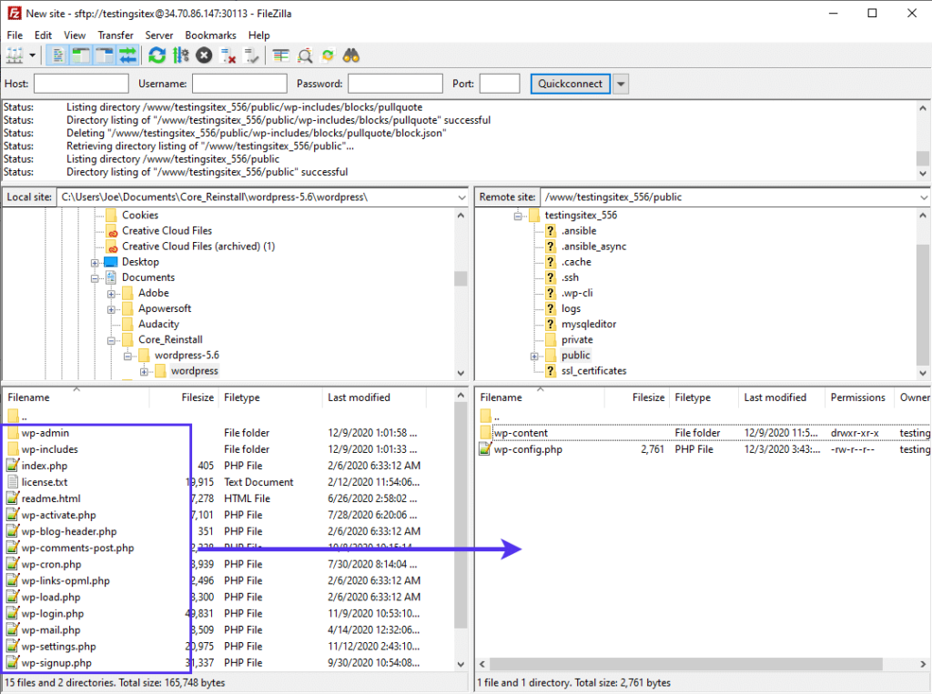 继续,现在是时候将所有新的核心文件传输到您的网站目录中了。根据您的FTP客户端,这通常涉及您拖动新的核心文件以替换旧的核心文件或可能从您的计算机上传它们。