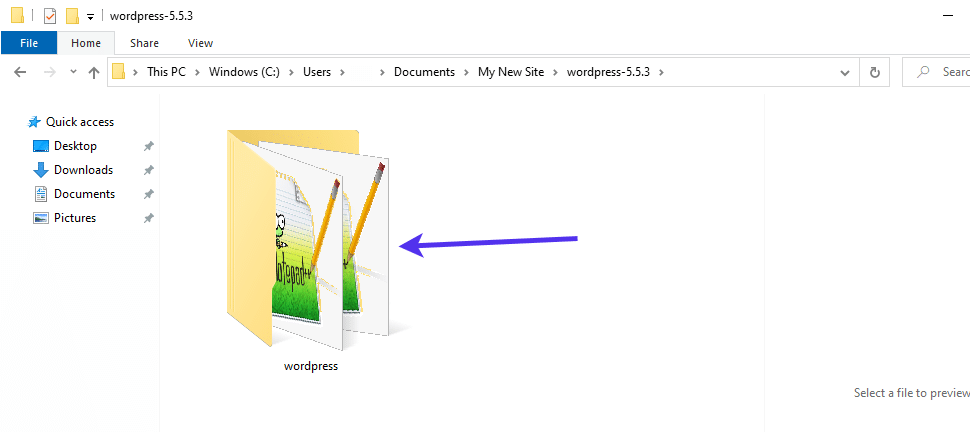 在您的计算机上,解压缩新的核心文件,使其旁边有一个常规文件夹,名称相同。打开该文件夹并单击进入WordPress文件夹以显示新的核心文件。