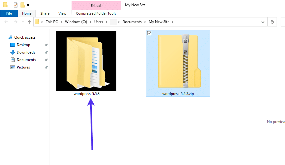 将文件放在您会记住的本地驱动器上。解压缩该文件以显示WordPress文件。它应该命名为“wordpress-[version]”。