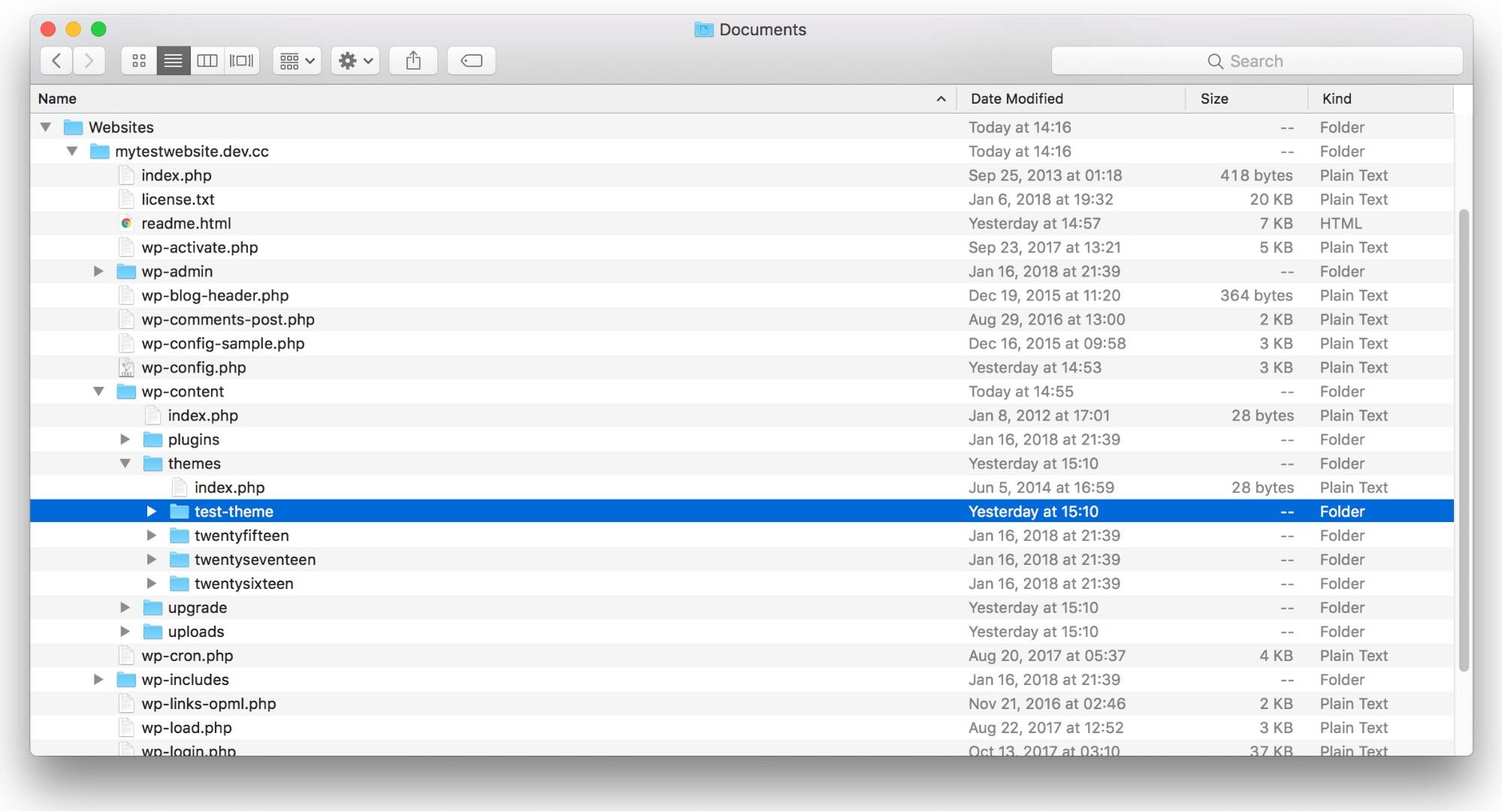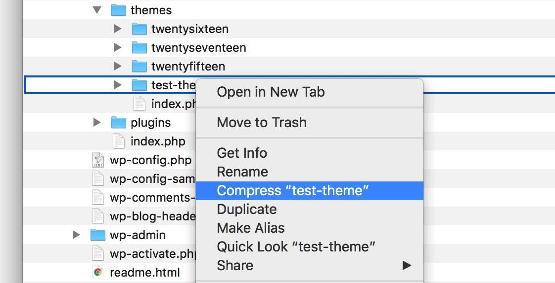 当您彻底测试了您的主题并确信它符合要求的标准时,现在剩下的就是导出它。最简单的方法就是找到网站在本地计算机上的安装位置,最有可能在默认文档目录中名为网站的文件夹中。打开网站的文件夹并访问/wp-content/themes/,您将在其中找到您的主题。