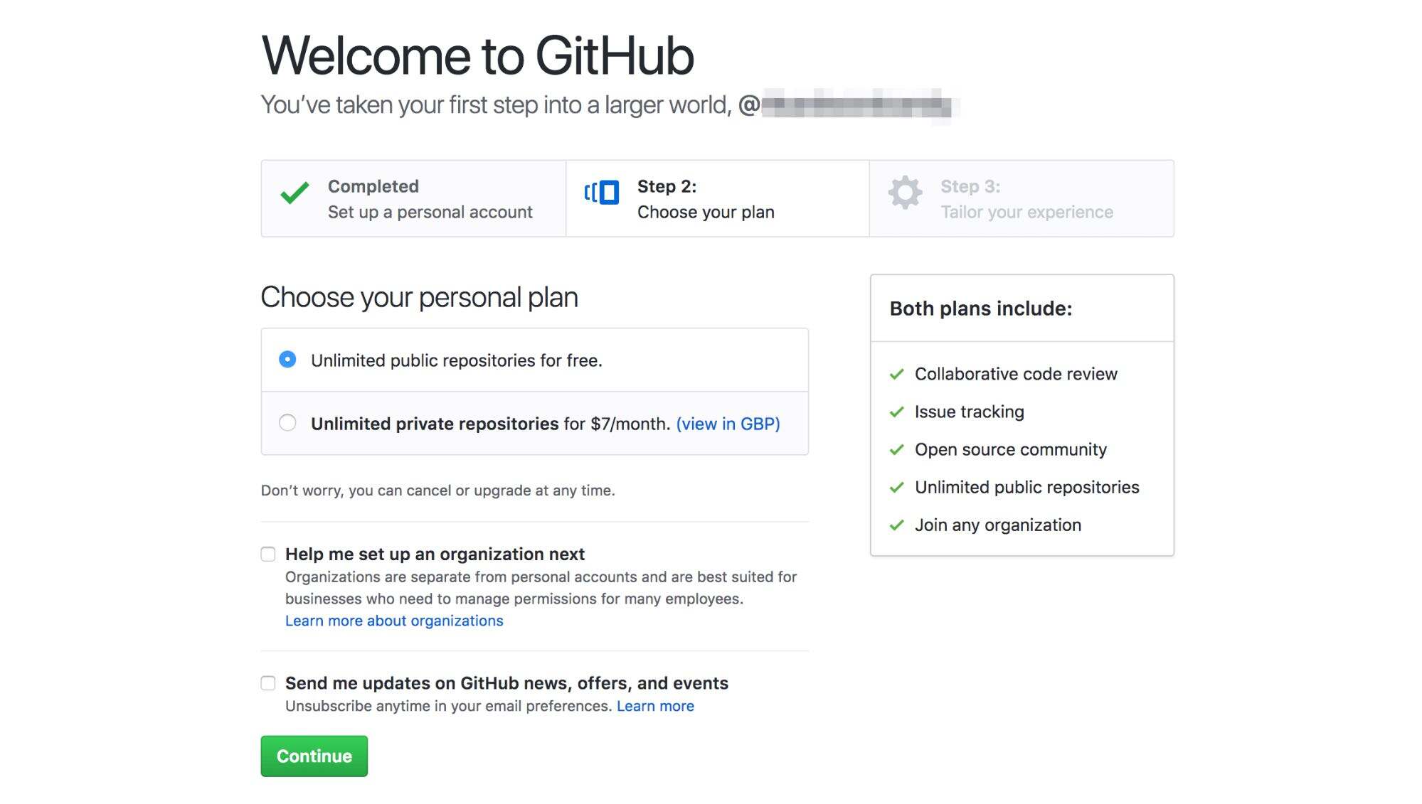 当您继续下一步时,系统会询问您要使用什么计划。您应该在此处选择Unlimited public repositories for free选项,然后选择Continue。