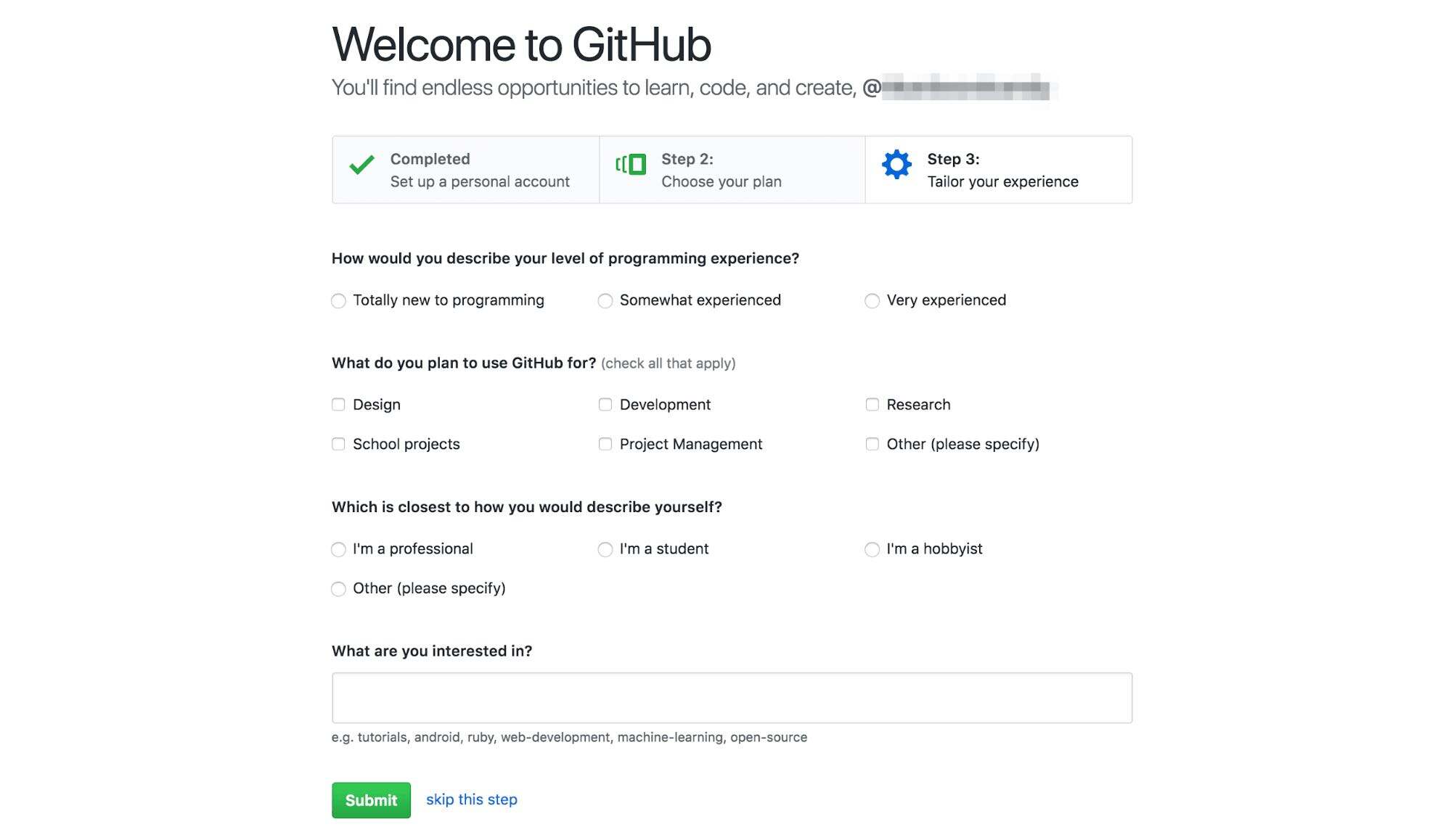 最后一步涉及根据您以前的经验水平自定义您的帐户。您可以在此处选择适用于您的选项,然后单击提交以创建您的帐户。