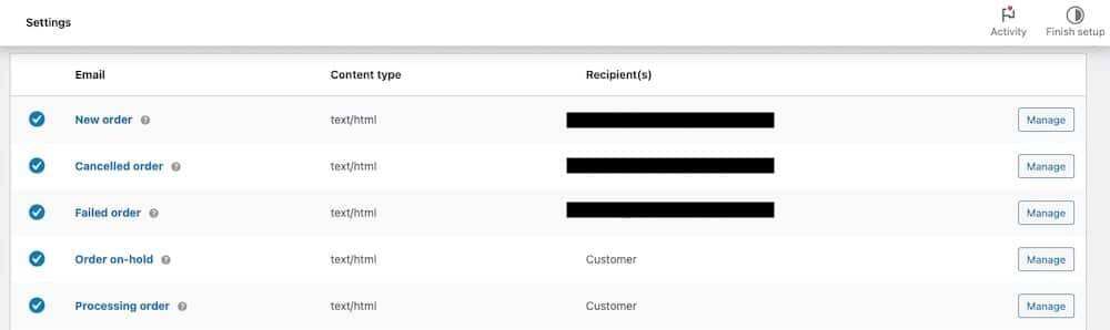 首先,进入 WordPress 面板中的 WooCommerce>Settings>Emails。在这里,您会看到一个电子邮件类型列表,如新订单、取消订单和已完成订单。这些都是 WooCommerce 根据不同情况向您或您的客户发送的不同电子邮件。