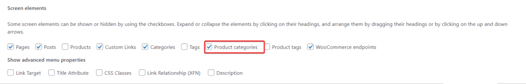- 点击右上角的“屏幕选项”选项卡,确保选中“产品类别”复选框。