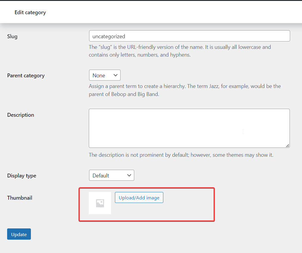 - 向下滚动到“缩略图”部分,然后单击“上传/添加图片”设置类别图片。