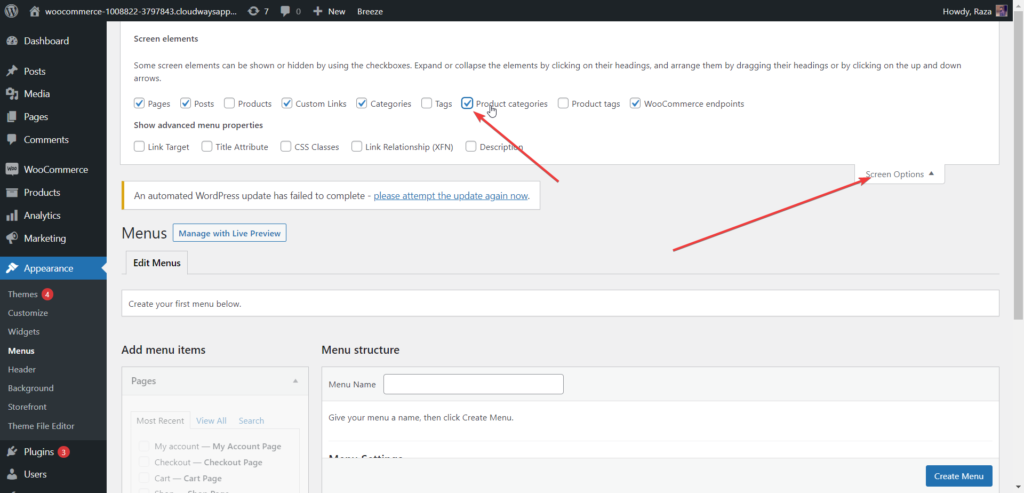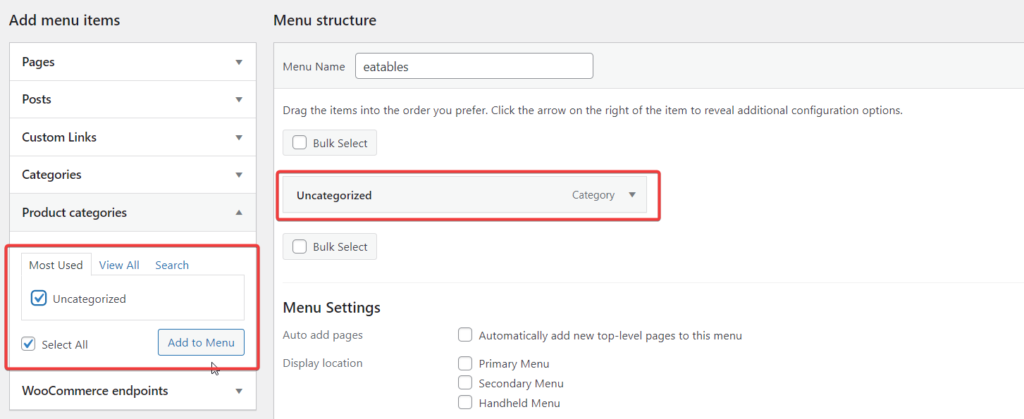 - 在左侧窗格中,会出现一个新标签,标题为“Product Categories”。单击它展开,选择你想要的类别,然后单击添加到菜单。