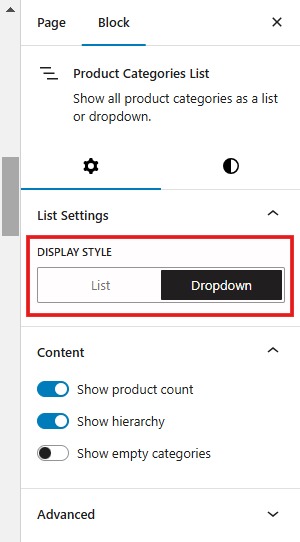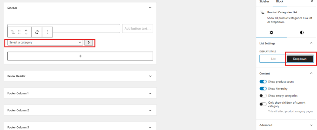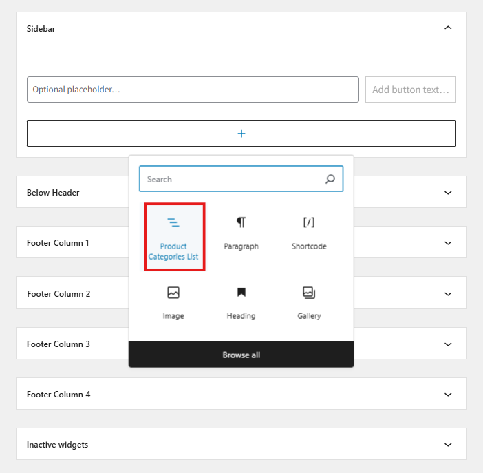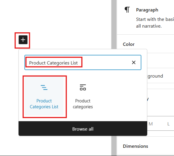 按下 +(添加区块) 按钮并搜索“Product Categories List”。