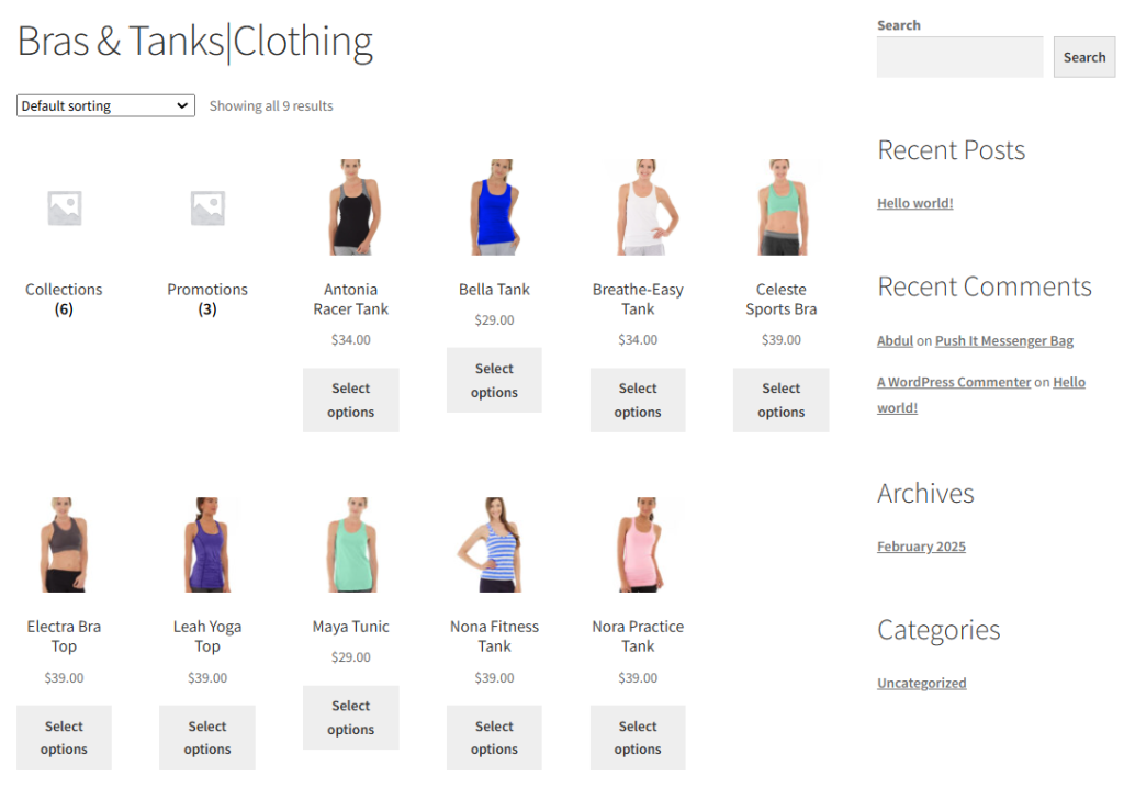 点击一个类别将显示它下面的子类别和产品–这正是网上商店应该有的样子。例如,我可以看到我商店中的“Bras & Tanks”类别有一个子类别“Clothing”。