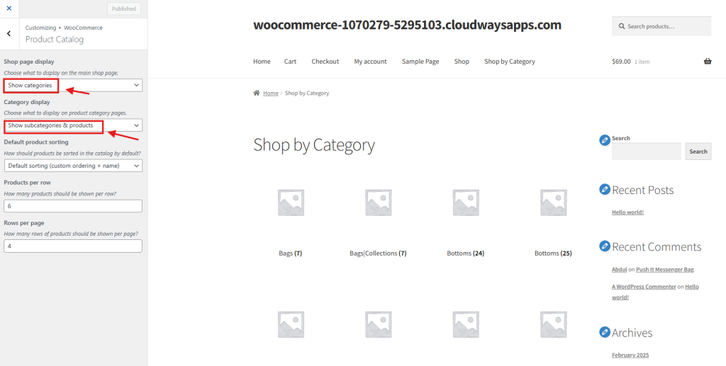 如果你想让 WooCommerce 自动处理布局,WordPress 定制器是最简单的方法。您可以控制商店页面是否只显示类别、显示带子类别的类别或混合显示所有类别。