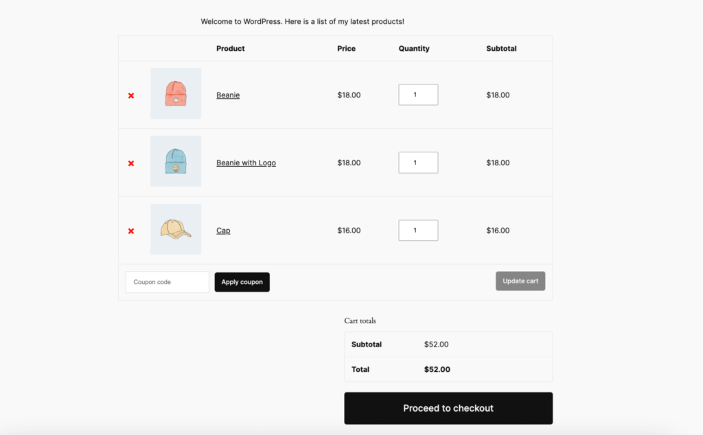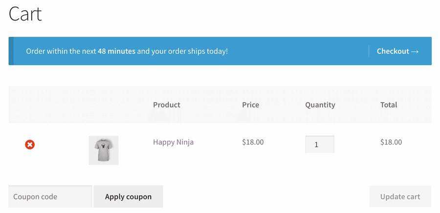例如,[woocommerce_cart]快捷代码可显示购物车页面,包括所有购物车项目、数量和总价。