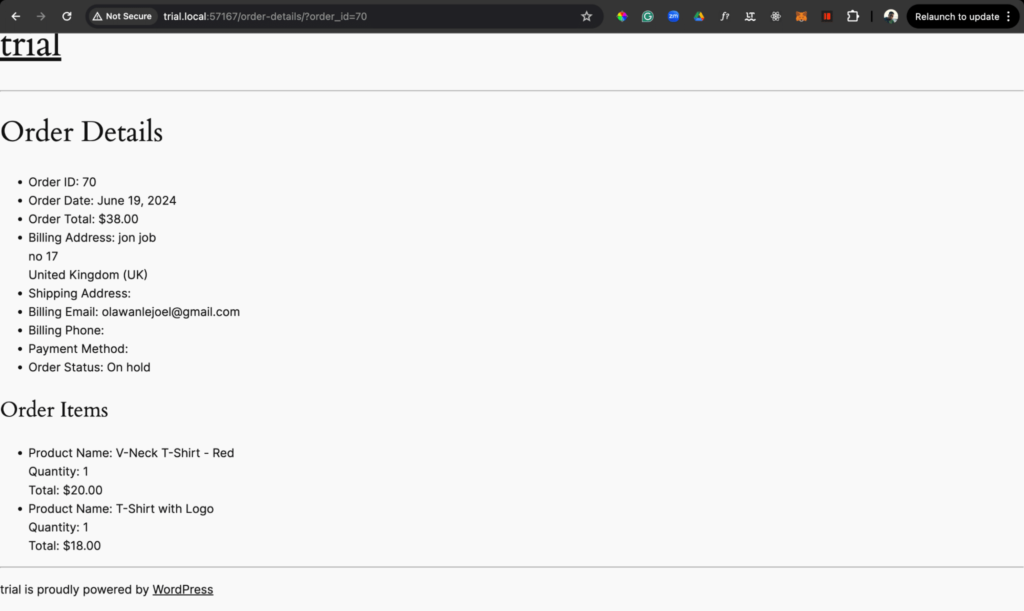 要进行测试,请浏览浏览器并在 URL 上添加 ?order_id=ORDER_ID,用有效的 WooCommerce 订单 ID 替换 ORDER_ID 。例如,https://yourwebsite.com/order-details/?order_id=70