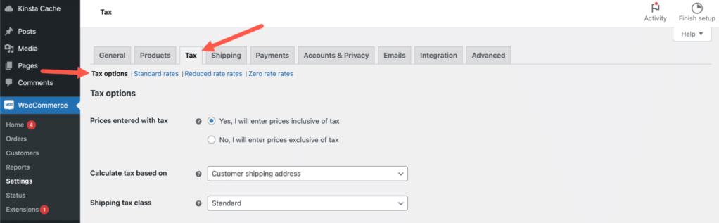 现在,税项已启用,您可以前往 WooCommerce 设置中的新 Tax 选项卡配置您的税项选项: