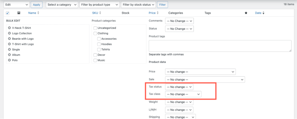 在批量编辑器中,您可以一次性为所有选定产品设置 Tax status(税收状态)和 Tax class(税收类别)。