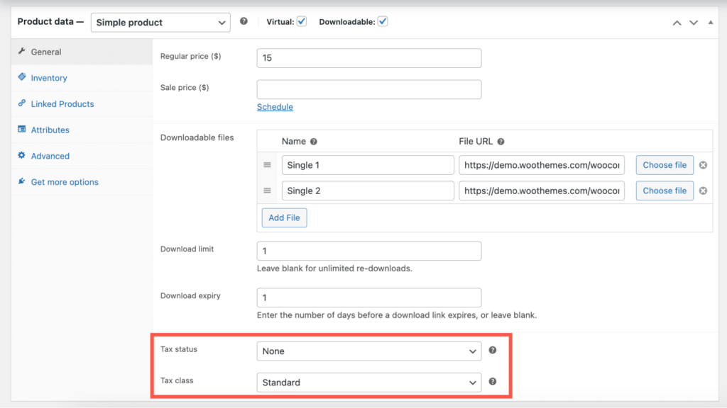 在 “Product data” 部分,单击 “General” 选项卡,找到 “Tax status” 和 “Tax class” 字段。