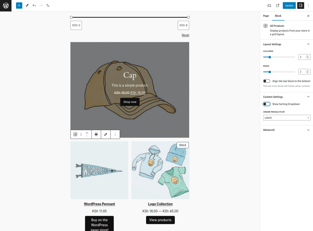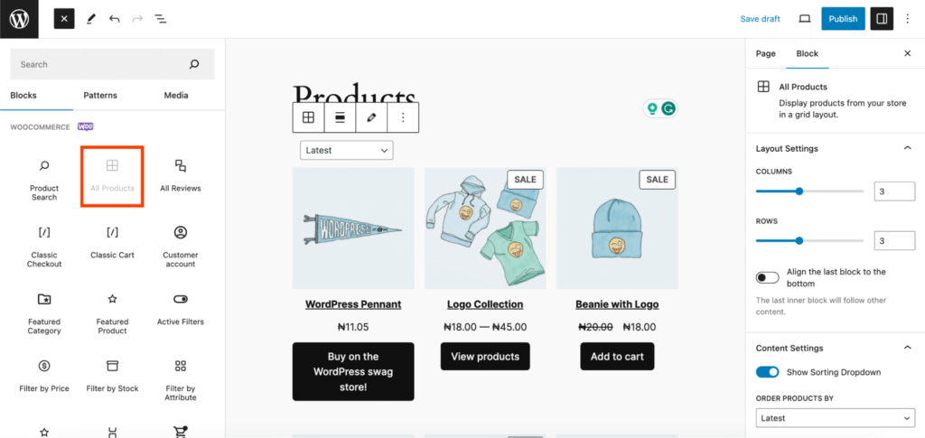 3. 使用 All Products WooCommerce Block 在网格中显示产品。