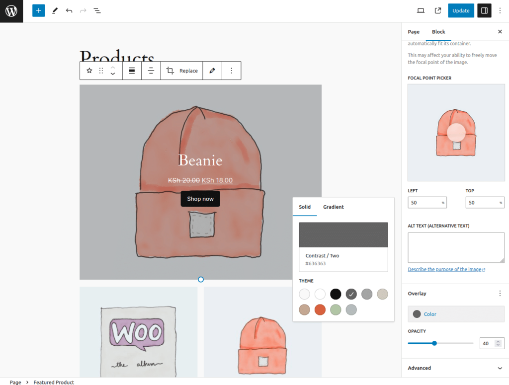 精选产品(Featured Product)区块可让您在页面或文章中突出显示产品。您可以选择一个产品,自定义其显示设置,然后将其添加到您的内容中,以吸引人们对您想展示的特定产品的关注。