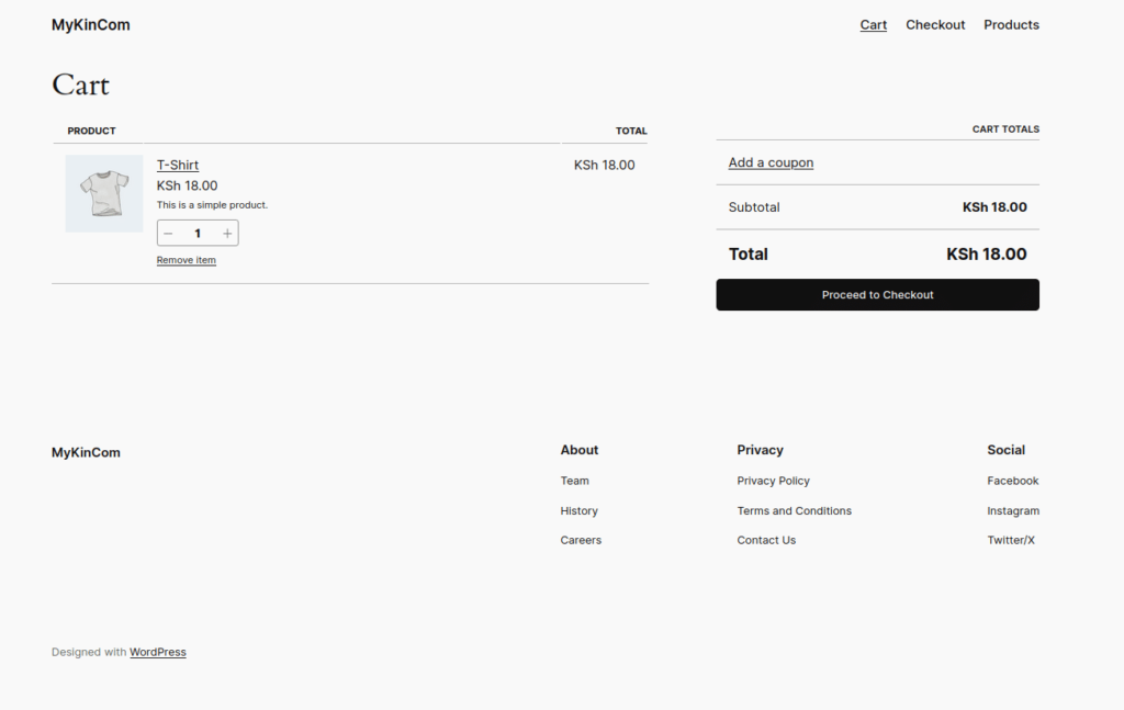 WooCommerce 默认使用适当的区块创建购物车和结账页面。客户可以将产品添加到购物车,并通过导航栏访问购物车。