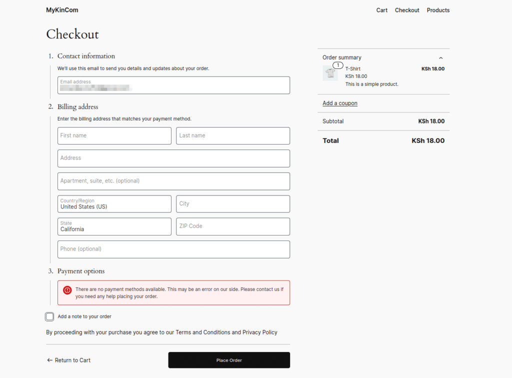 确认购物车内容后,客户可以选择 “Proceed to Checkout” 按钮,填写必要的详细信息,然后下订单。