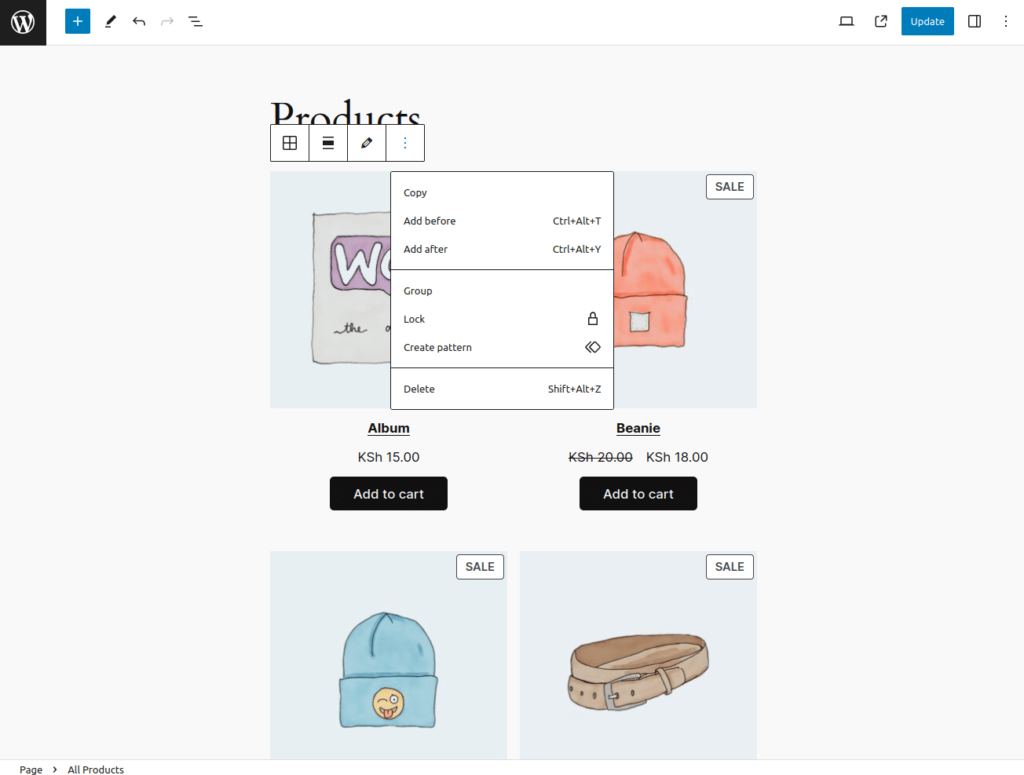 - 导航至要添加区块的页面或帖子。本指南使用与前面步骤相同的 “Products” 页面。