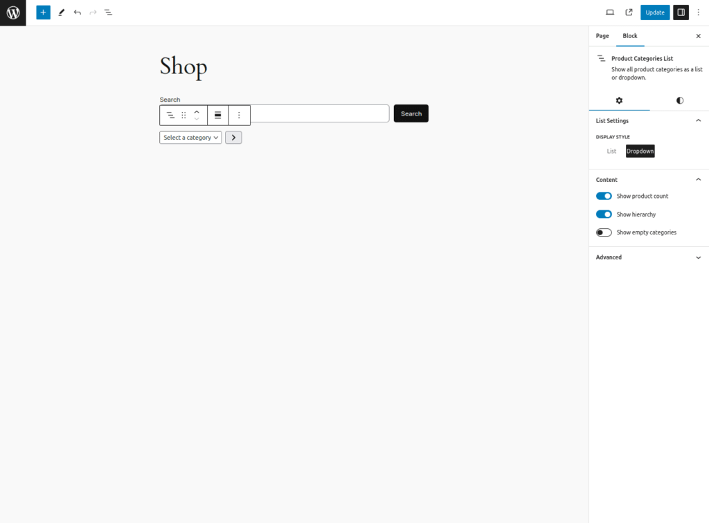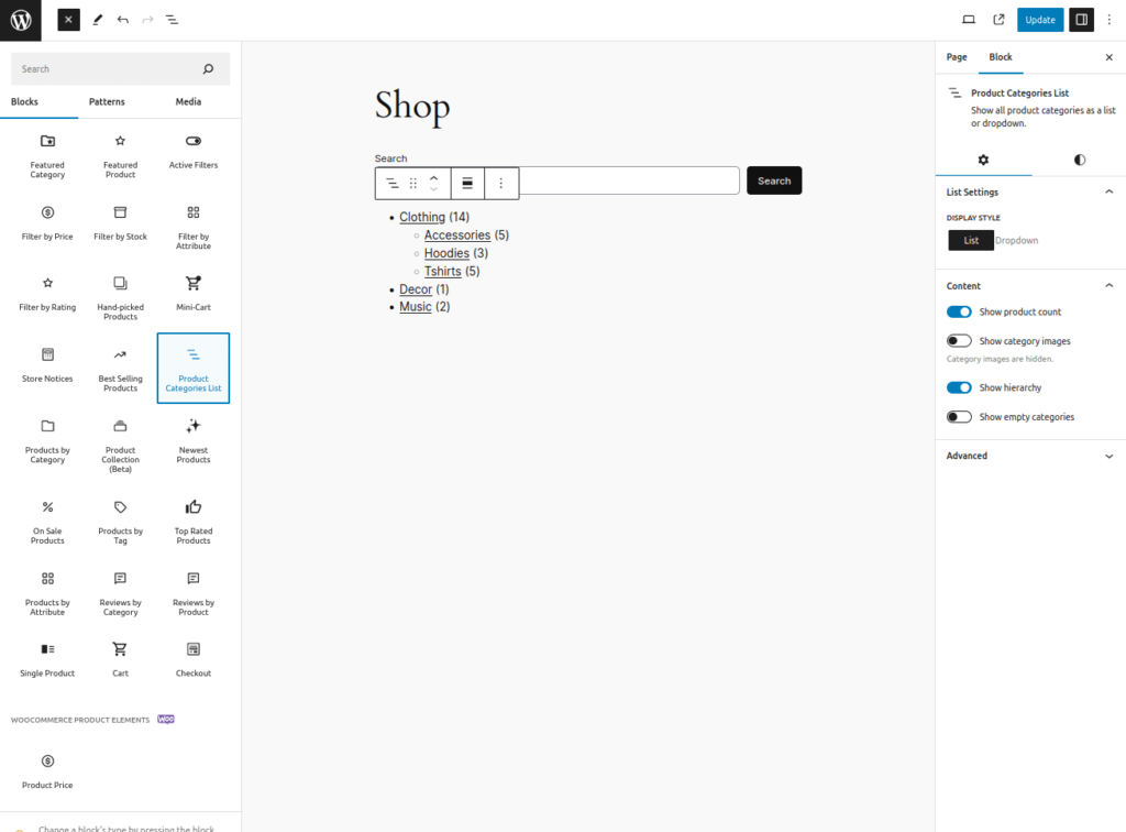 3. 添加 Product Categories List 区块。