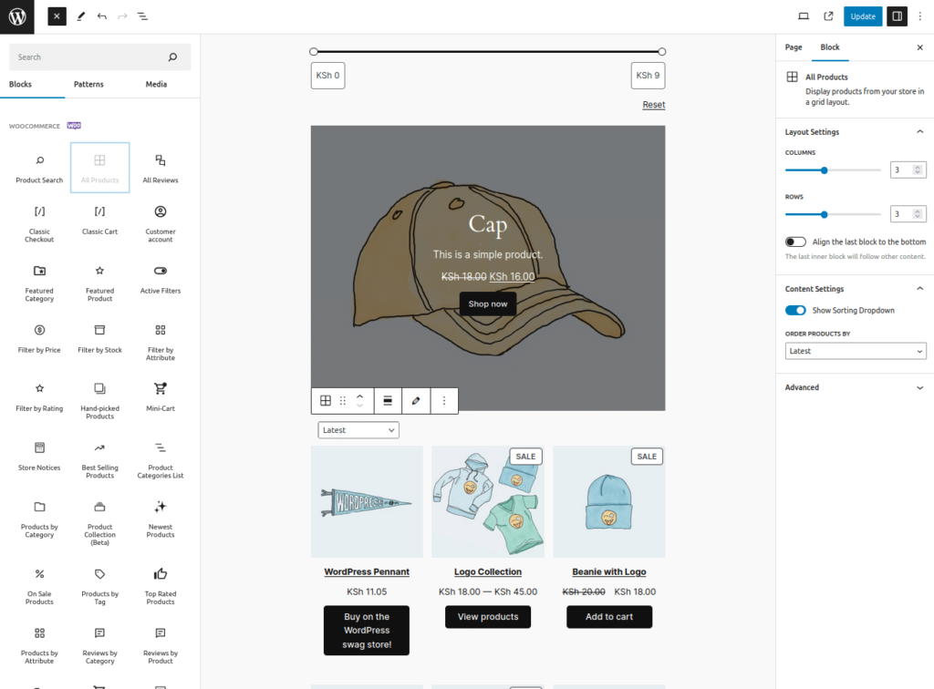 现在,您已经学会了如何使用某些 WooCommerce 区块,下一步就是将它们组合起来,用以下去块创建一个用户友好的自定义商店页面: