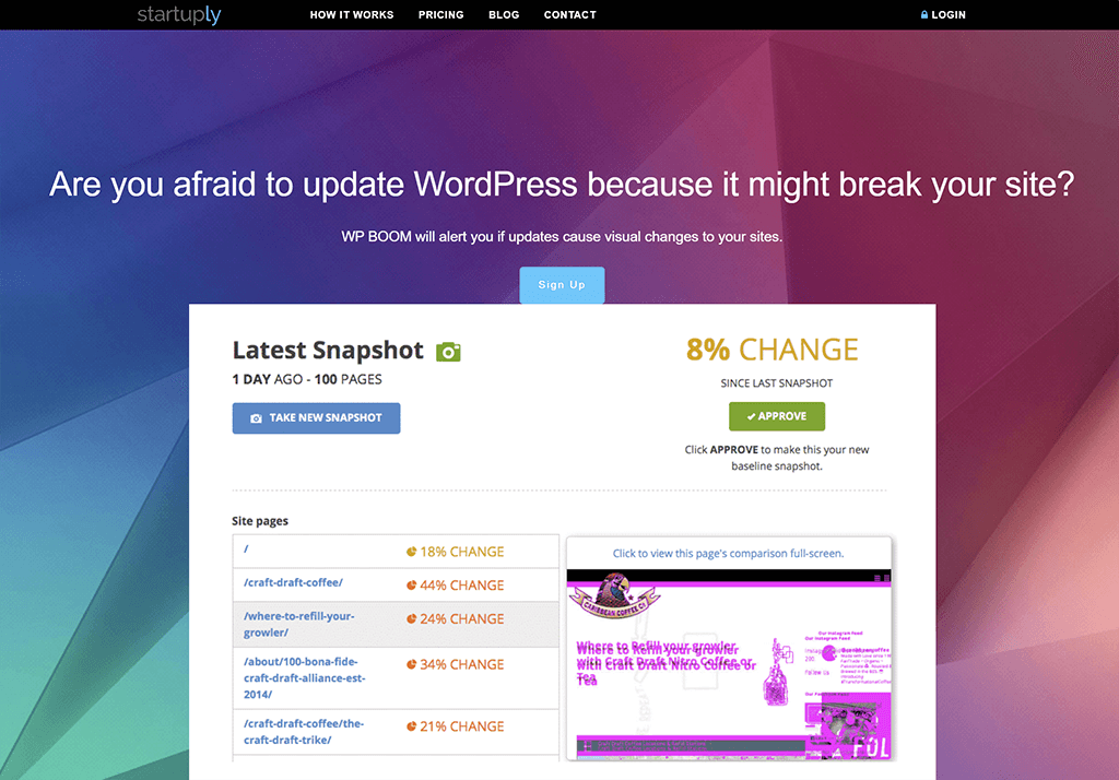 有了 WP Boom 这样的可视化对比工具(本教程将使用该工具),你就可以给网站拍一张快照,点击 “更新”,然后再拍一张快照,这样你就可以快速查看哪些地方发生了变化:
